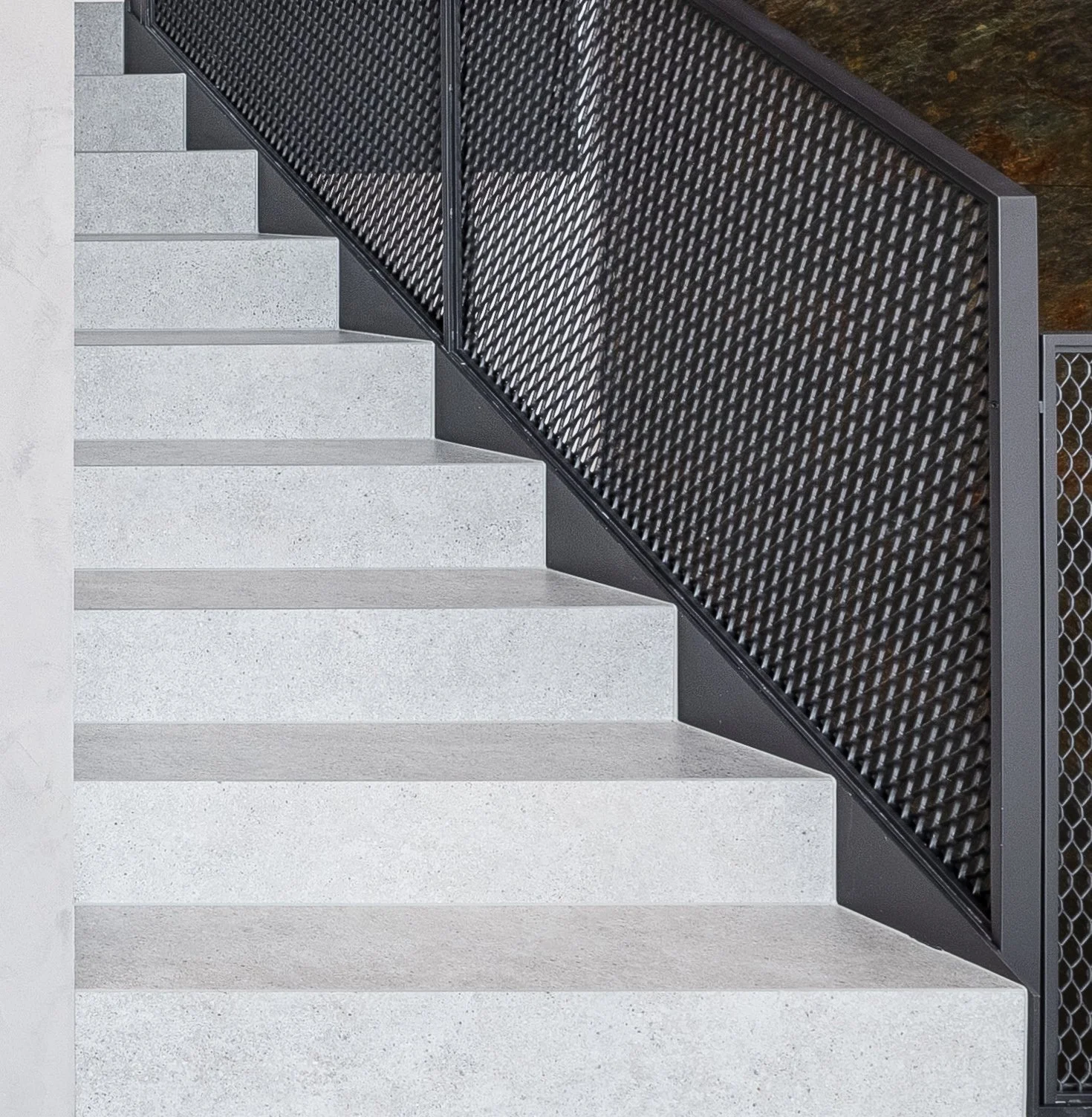 Sur des marches classiques, protégées par des profils métalliques, l’angle est visible, souligné, parfois même accentué. Avec une coupe en onglet, au contraire, la ligne disparait et l’escalier gagne en cohérence.