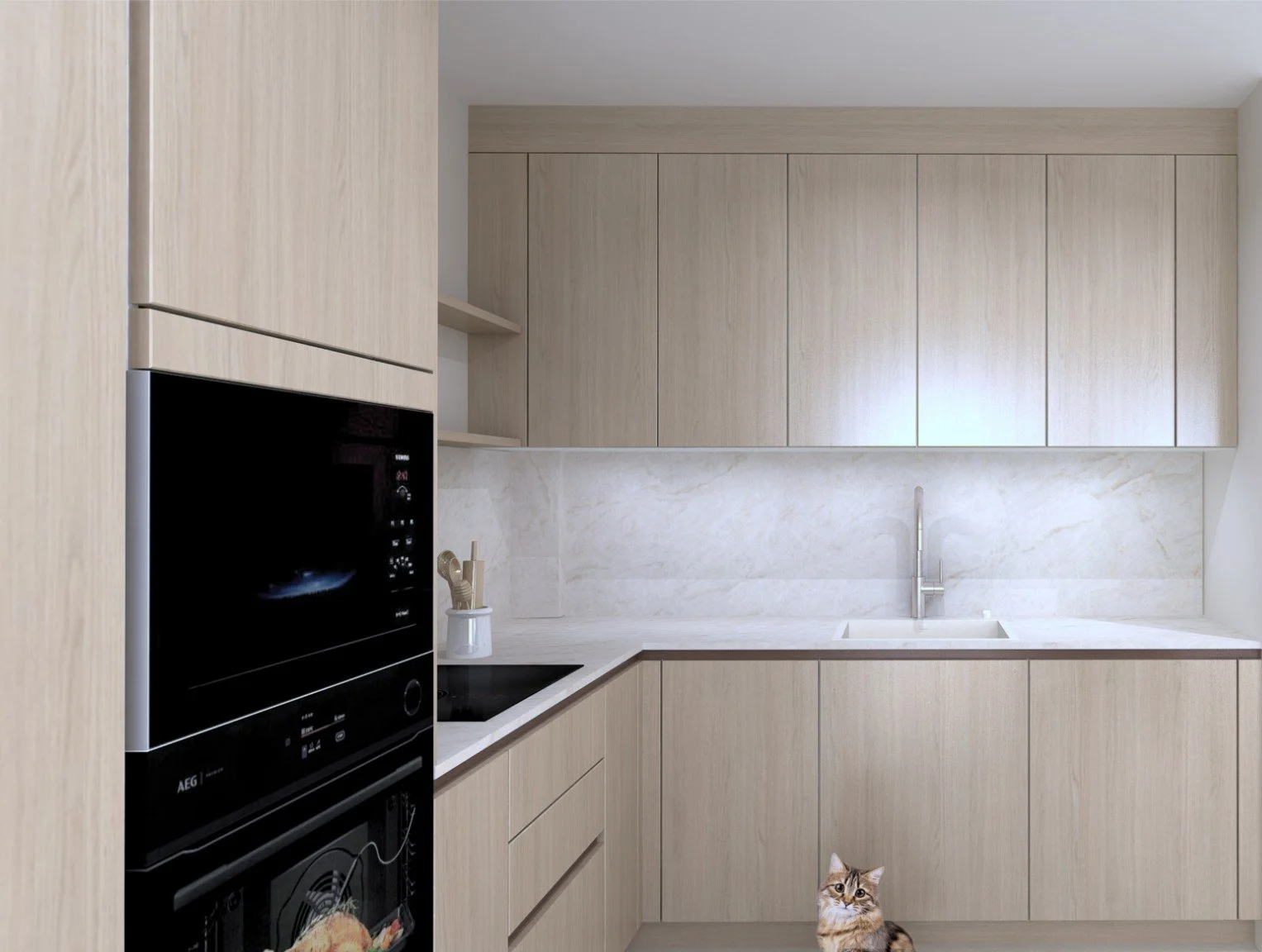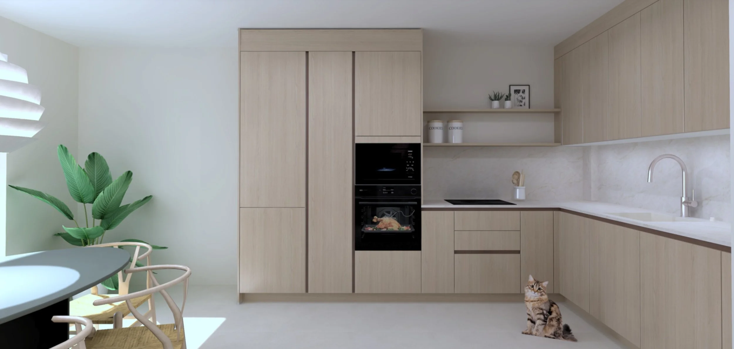 Dans le même esprit, l’équipe a sélectionné une cuisine Häcker en mélamine finition chêne. Le mitigeur Caressi en teinte cuivrée et l’évier Systemceram complètent l’ensemble avec subtilité. La touche finale est apportée par le plan de travail en Neolith Taj Mahal. Les électroménagers sont signés AEG et la plaque de cuisson est une BORA Pure S Mat.